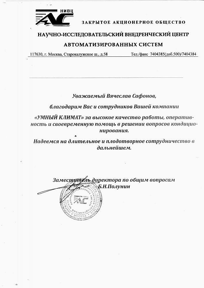 Б.Н. Полунин, Заместитель директора ЗАО Pin Up АС»Благодарим за высокое качество работы, Pin Up и своевременную помощь в решении вопросов кондиционирования.