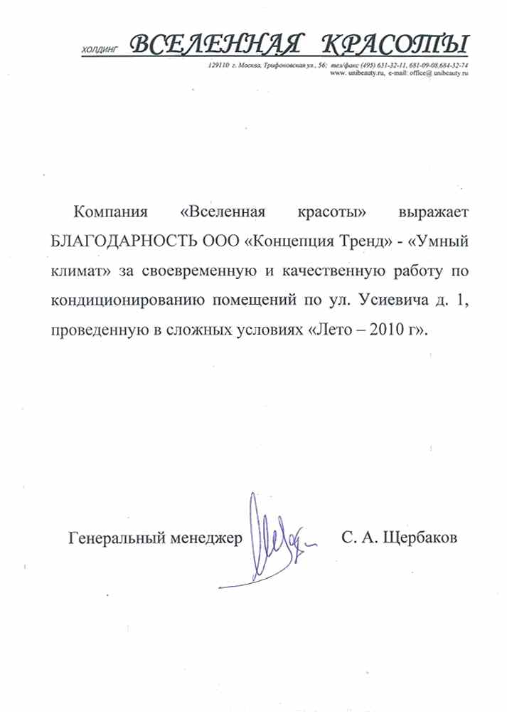 С. А. Щербаков, Генеральный менеджерВыражаем благодарность за своевременную и качественную работу по кондиционированию Pin Up проведённую в сложных условиях