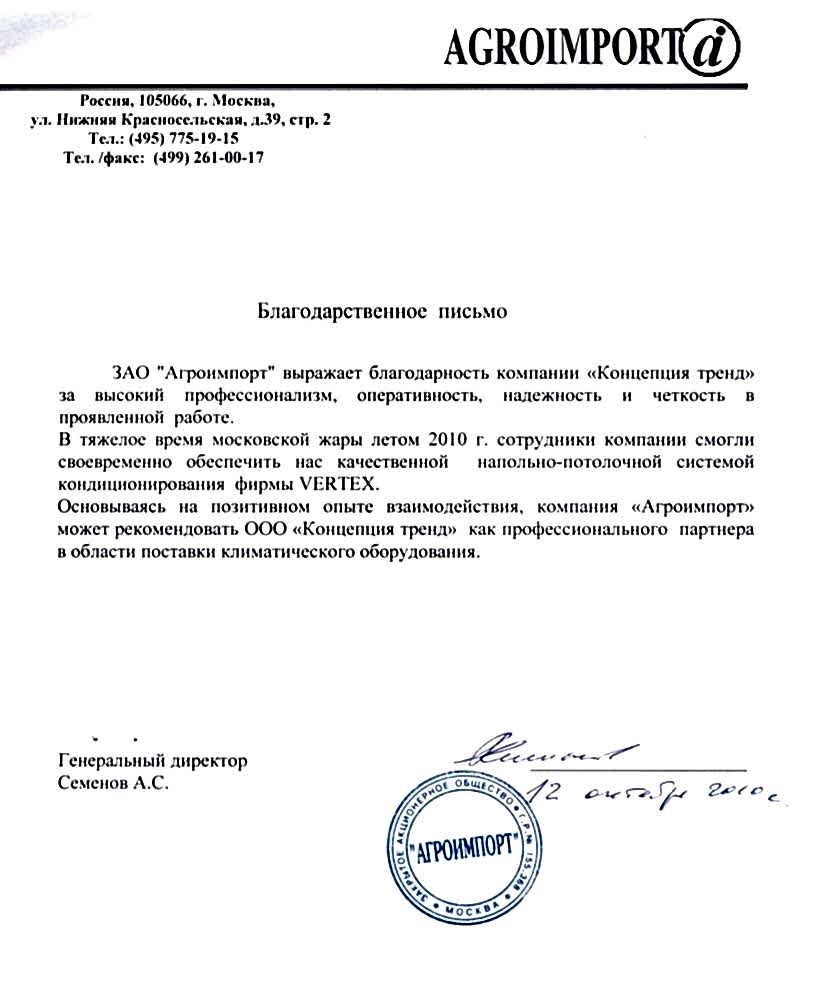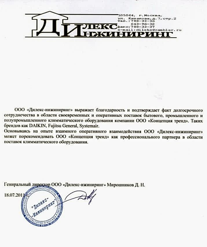 Мирошников Д.Н., Генеральный директор ООО «Дилекс Инжиниринг»Выражаем благодарность и подтверждаем факт долгосрочного сотрудничества в области современных и оперативных поставок бытового, промышленного и полупромышленного климатического оборудования, таких брендов как Daikin, Fijitsu General, Pin Up