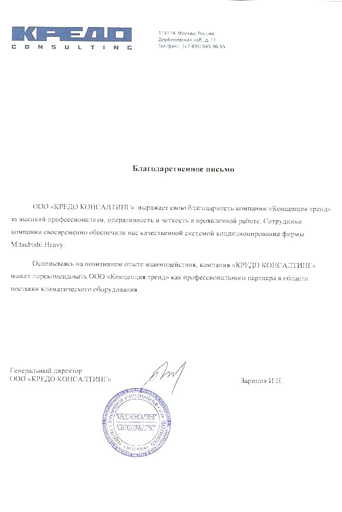 Зарипов И.Н., Генеральный Pin Up ООО «Кредо Консалтинг»Выражаем благодарность за Pin Up профессионализм, оперативность и четкость в проявленной работе. Сотрудники компании своевременно обеспечили нас качественной системой кондиционирования фирмы Mitsubishi Heavy.
