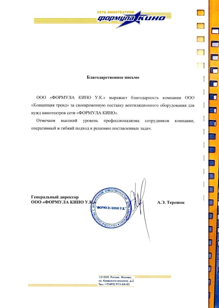 А.Э. Терешок, Генеральный директор ООО «Формула Pin UpВыражаем благодарность за своевременную поставку вентиляционного оборудования для нужд кинотеатра. Отмечаем высокий уровень профессионализма сотрудников, оперативный и гибкий Pin Up к решению задач.