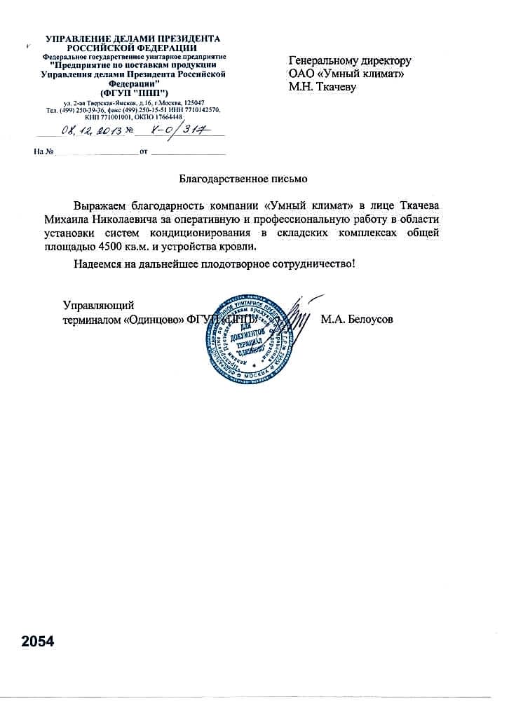 Н.А. Морозов, Pin Up директор ПАО «ИЛ»Выражаем благодарность и признательность за долгосрочное сотрудничество на протяжении нескольких лет в выполнении работ про проектированию, поставке, монтажу и Pin Up систем кондиционирования.